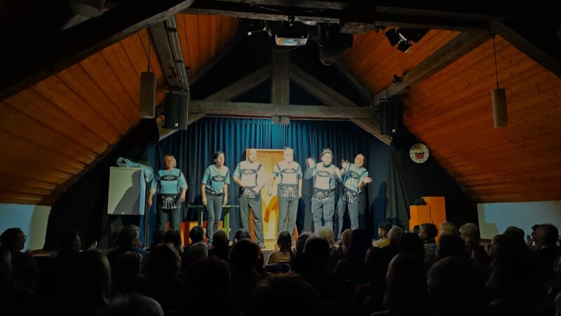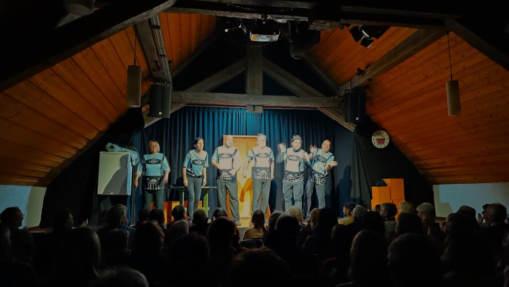 Neben Florian Angele und Oliver Kübler aus Aulendorf kommen weitere Akteure dieser Gruppe bis vom Chiemgau und aus Vorarlberg. Texte und Regie stammen von Thomas Beck, Zußdorf. Mit Scharfsinn werden hier menschliche und gesellschaftliche Verhaltensweisen mit Scharfsinn, Tiefsinn aber auch Blödsinn auf die Schippe genommen. Beinahe drei Stunden vergingen wie im Fluge, selten konnte so viel gelacht werden. Somit gab es auch obligatorische Zugaben.